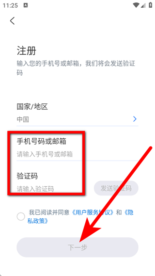 3、在注册页面,输入手机号码和验证码,点击下一步。
