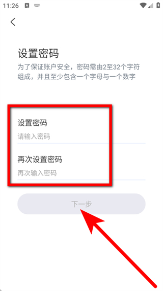 4、在设置密码页面,设置密码,点击下一步,完成注册。