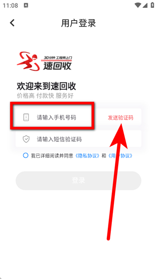 3、在用户登录页面,输入手机号,点击发送验证码。