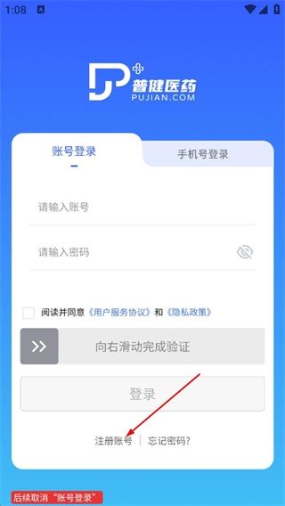 1、在普健医药登录页,点击注册账号选项,进入账号注册页面。