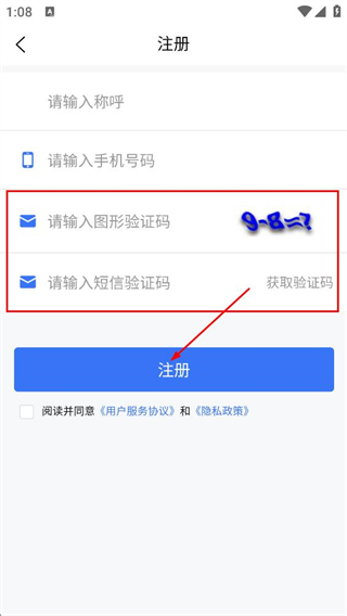 3、在注册页面,填写图形验证码,点击获取验证码后填写短信验证码,点击注册,完成账号注册。