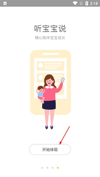 1、打开听宝宝说育儿陪伴APP,在启动界面找到开始体验按钮,点击该按钮进入应用。