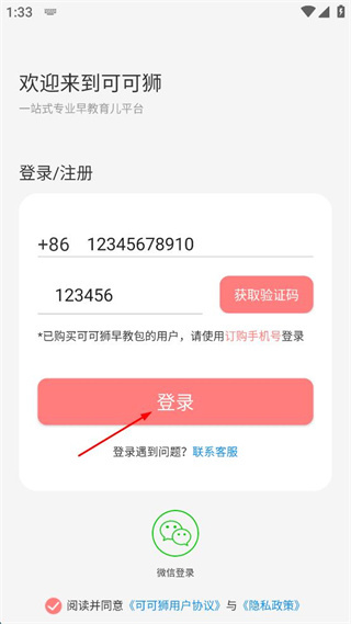 3、确认已勾选相关协议选项后,点击登录按钮,完成账号登录以使用该APP的早教功能。