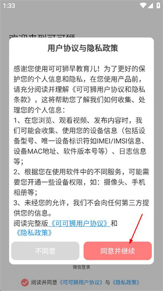 1、打开可可狮早教育儿APP,查看弹出的用户协议与隐私政策提示,点击同意并继续按钮进入应用。