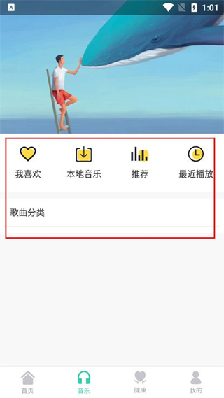 4、登录成功后切换到底部导航栏的音乐选项,进入音乐页面查看相关功能分类内容。