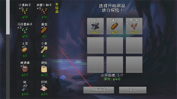 1、在准备界面选择物资如种子、面包放入右侧栏,点击开始游戏进入殖民地。