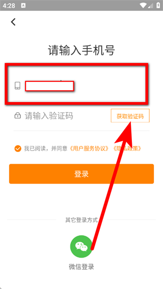 3、在请输入手机号页面,输入手机号,点击获取验证码。