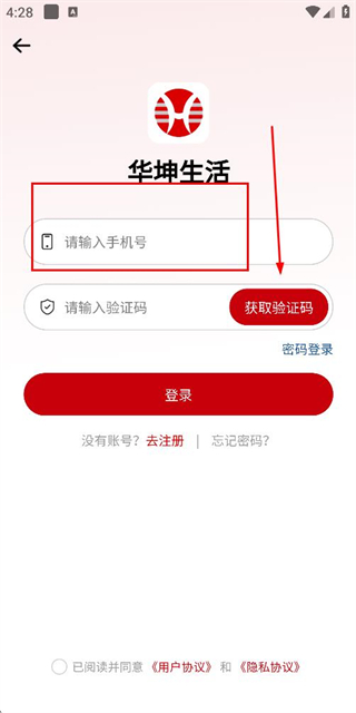 2、在登录页面填写手机号,勾选协议后,点击获取验证码。
