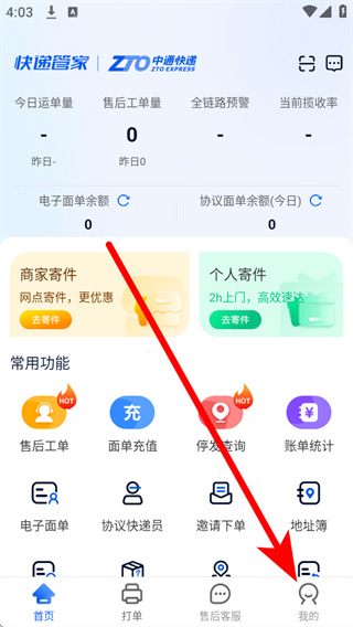 1、打开中通快递,点击底部导航栏的我的,进入个人中心页面。