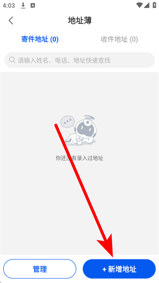 3、进入地址簿页面后,点击底部的新增地址,进入新增寄件地址的填写界面。