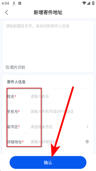 4、在新增寄件地址页面,填写必填信息,确认信息无误后点击确认,即可完成寄件地址的添加。
