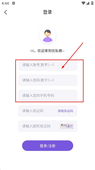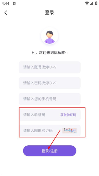 4、填写验证码和图形验证码后,点击登录/注册按钮,完成操作。