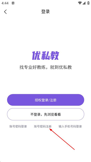 2、在登录页面,点击账号密码注册选项,进入注册界面。