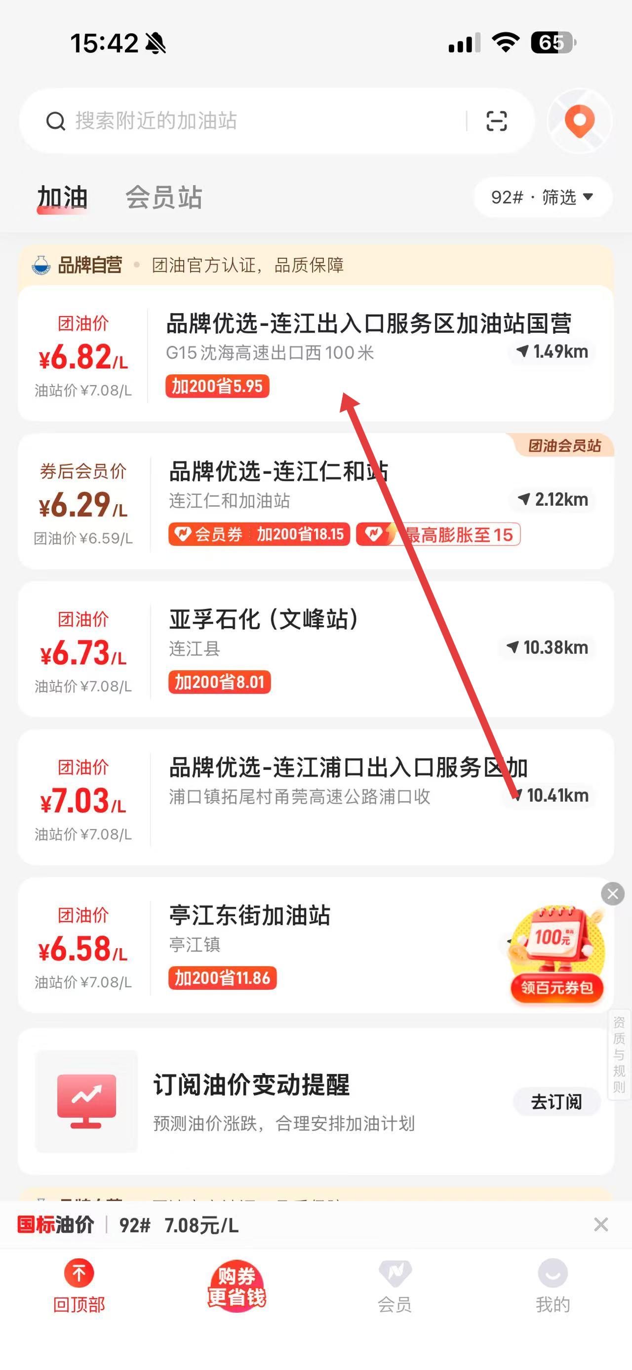 1、打开能链团油APP,在首页选附近加油站里想去的加油站。