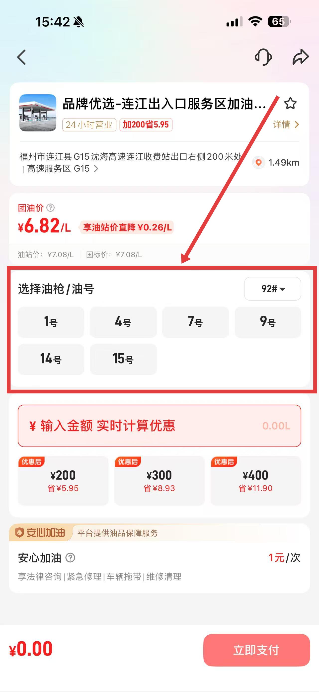 2、进入加油站页面,选油枪号和汽油型号如92号汽油。
