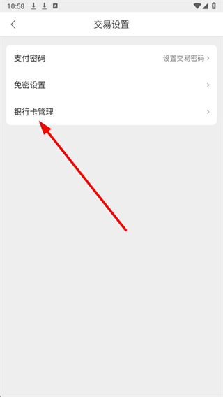 3、在交易设置界面,选择银行卡管理选项,进入银行卡管理页面。