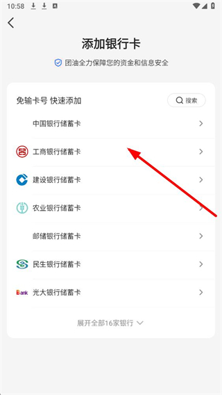 5、在添加银行卡界面,选择目标银行,按提示完成银行卡信息填写即可完成绑定。