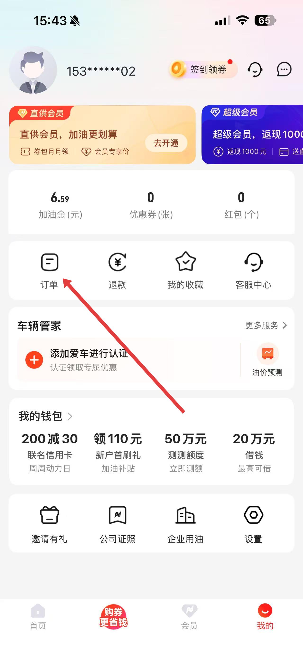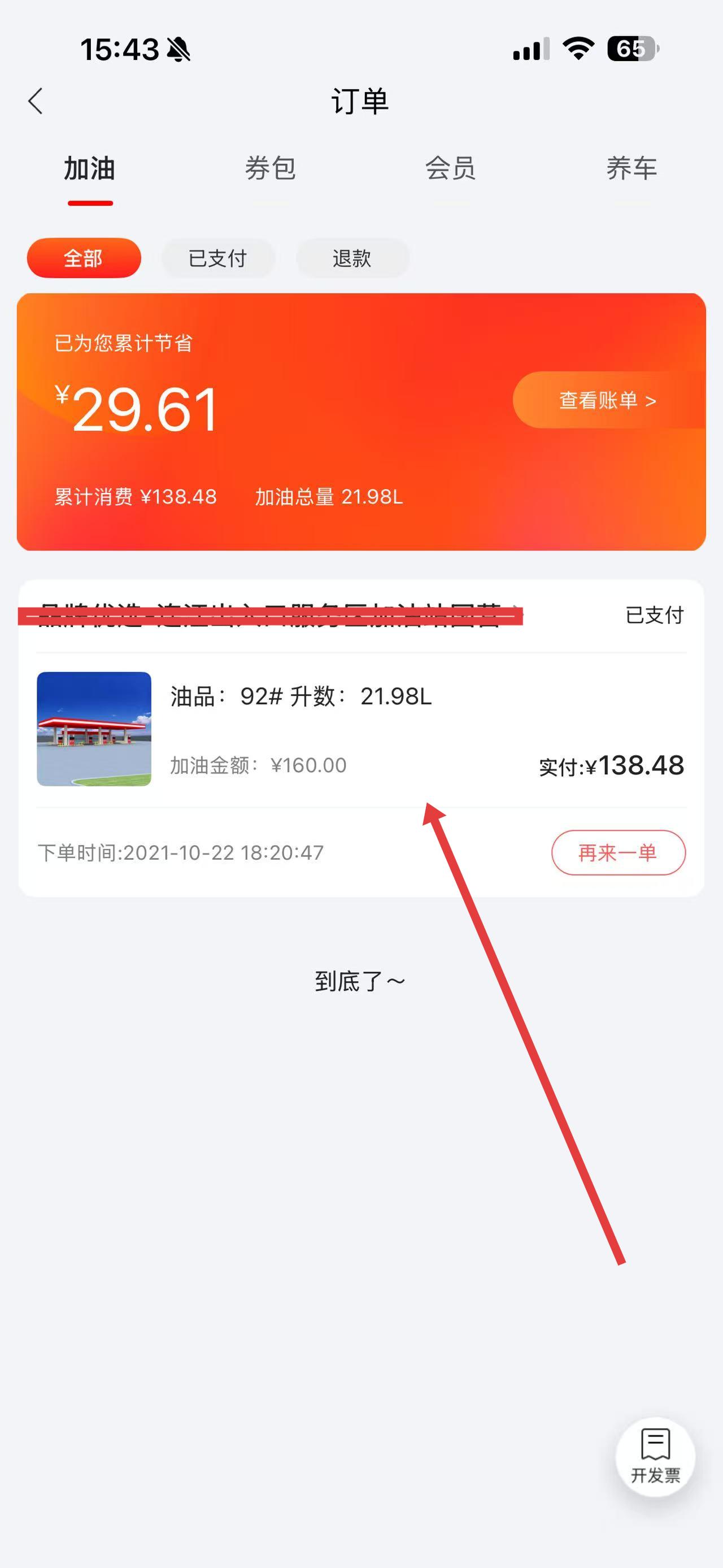 3、在订单界面找到需要开发票的加油订单,点击进入订单详情页。