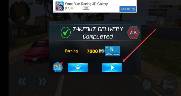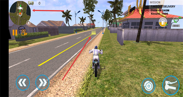 2、依据左上角地图的指引,操控摩托车前往指定地点,完成外卖的领取流程。