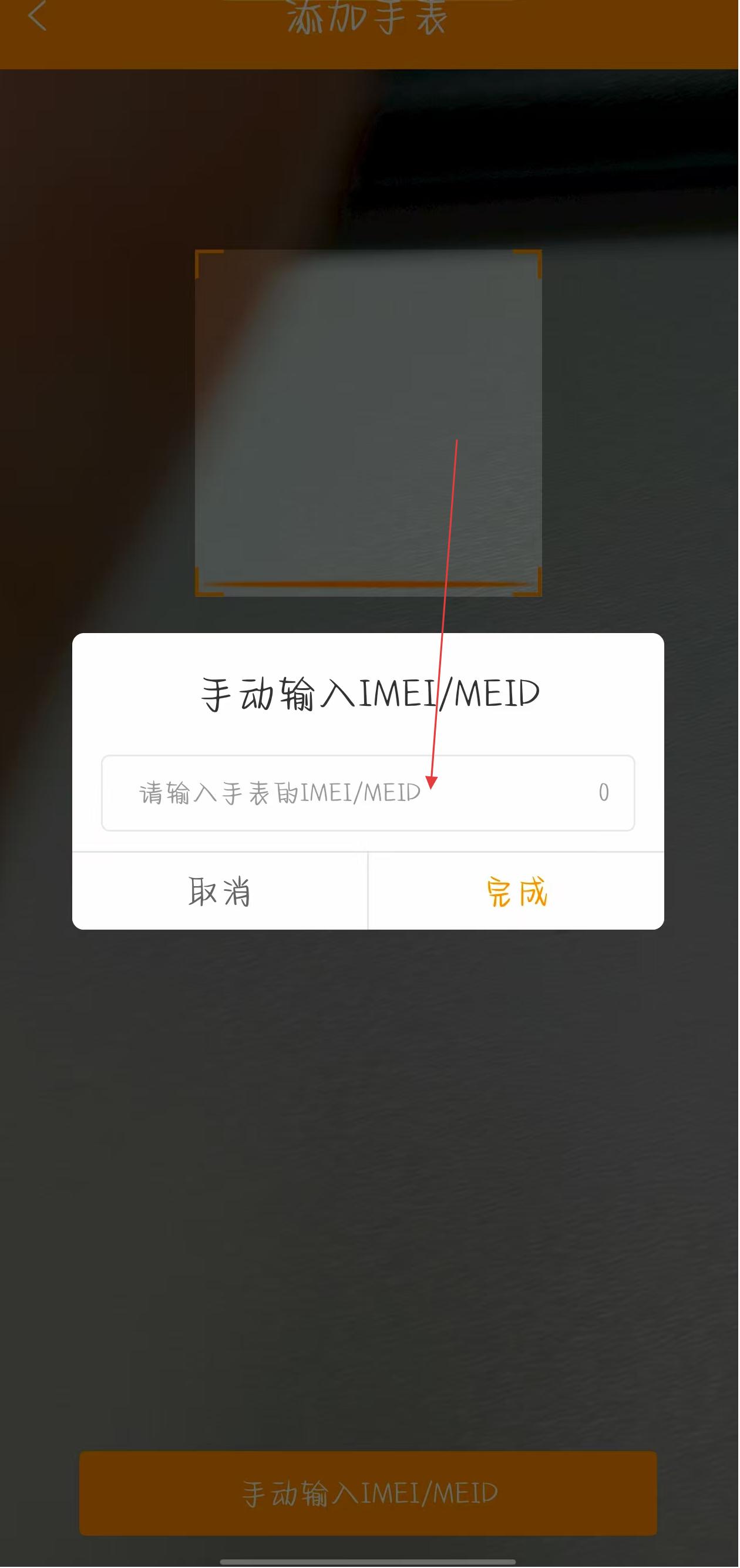 3、点击下方可以手动输入,点击手动输入IMEI/MEID按钮,在弹出的输入框中填写手表的IMEI/MEID号码。