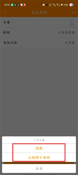 3、点击头像右侧的编辑图标,弹出上传头像的功能菜单。