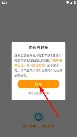1、打开智能守护5app,在弹出的窗口中点击同意。