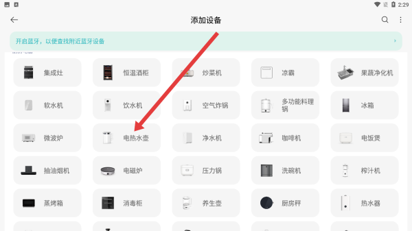 1、在添加设备页面内,找到电热水壶选项点击进入添加。