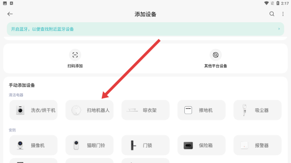 1、进入到添加设备页面后,找到手动添加设备区域下的扫地机器人进行添加操作。