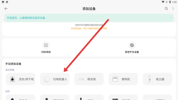 1、在添加设备页面中,找到并的点击扫地机器人,进行添加操作。