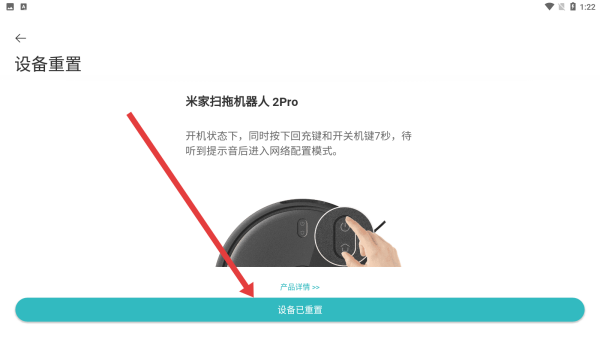 3、可以通过点击设备已重置按钮,进行连接添加该型号的扫地机器人。