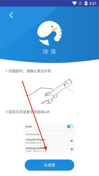 1、打开AnyScope对应的缘像APP,等待自动检测设备。