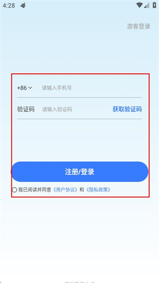 3、在登录页面,填写信息并勾选协议后,点击蓝色按钮即可完成登录。