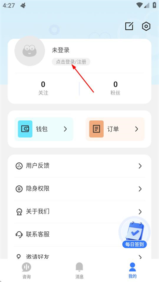 1、进入岸涌咨询后,点击底部的我的选项,可进入个人中心页面。