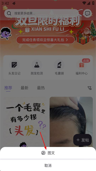 1、在发生首页,点击右下角的发帖按钮,会弹出发布类型选择弹窗。