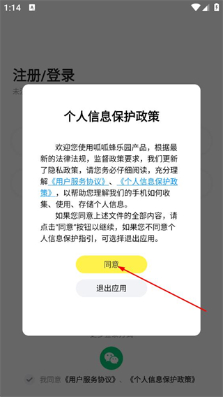 1、在呱呱蜂乐园的个人信息保护政策弹窗中,点击同意,进入注册/登录页面。