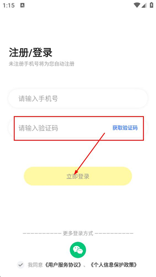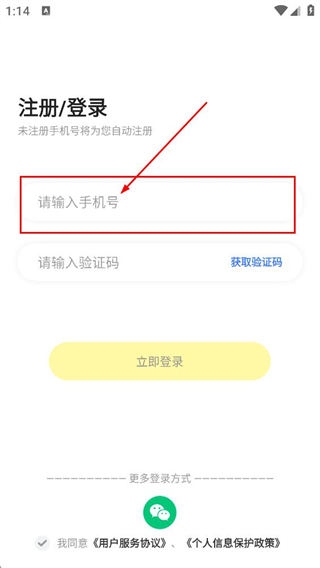 2、在注册/登录页面,填写请输入手机号对应的内容,准备获取登录验证码。