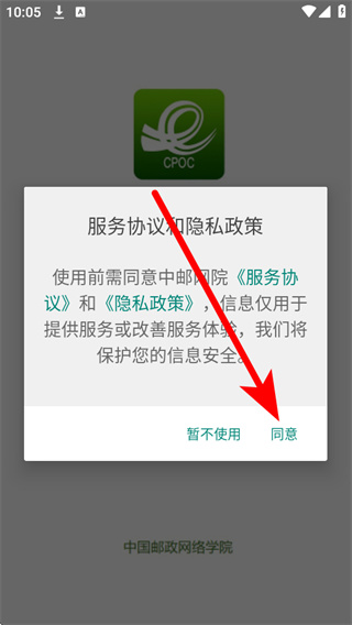 1、打开中邮网院,在弹窗中点击同意,进入应用界面。