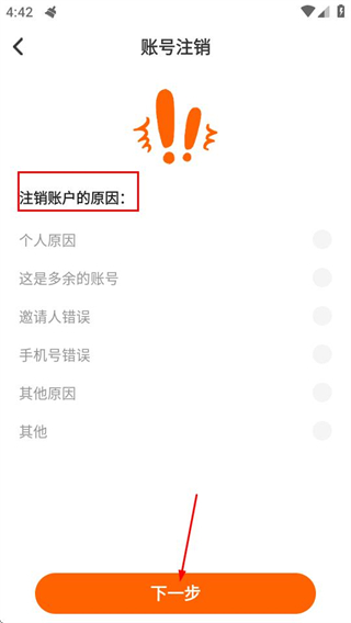 4、在注销原因页面,选择原因后点击下一步按钮,可进入账号注销验证页面。