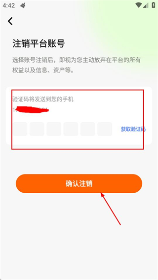 5、在验证页面,获取并填写验证码后点击确认注销按钮,即可完成账号注销。