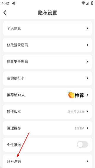 3、在隐私设置页面,点击账号注销选项,可进入账号注销原因选择页面。