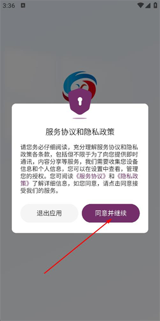 1、在使用协议隐私政策弹窗中点击同意并继续,进入登录页面。