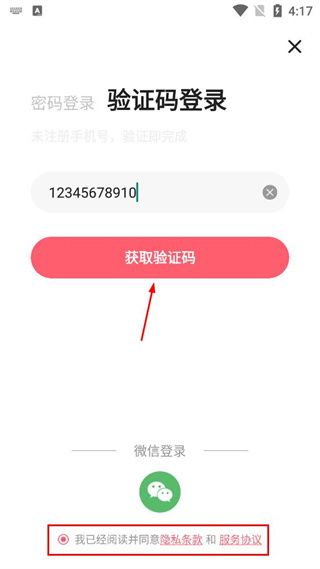 4、勾选已阅读并同意相关协议选项后,点击获取验证码按钮,获取登录所需验证码。