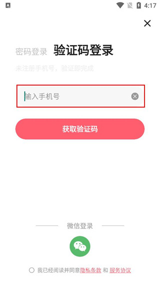 3、在验证码登录界面的输入框填写个人手机号码,准备获取对应的验证信息。