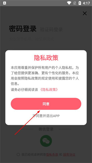 1、打开母婴服务类APP,查看弹出的隐私政策提示,点击同意按钮进入登录页面。