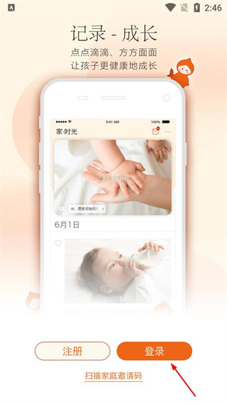 2、进入应用后,在记录成长页面找到登录按钮,点击该按钮进入手机号注册登录页面。
