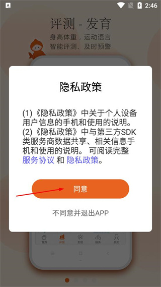 1、打开小鲤鱼育儿成长记录APP,查看弹出的隐私政策提示,点击同意按钮进入应用。