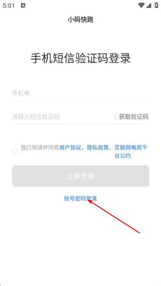 2、在短信验证码登录页面,点击账号密码登录选项,切换至账号密码登录界面。