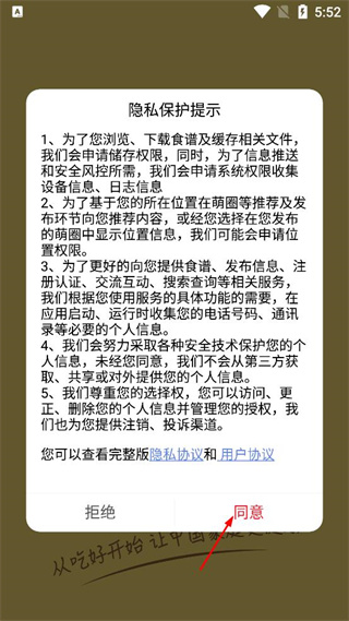 1、打开萌酱酱选软件,看到弹出的隐私保护提示窗口,找到窗口中的同意按钮并点击。