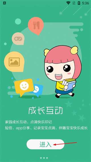 1、打开幼儿宝软件,看到显示成长互动的页面,找到页面下方的进入按钮并点击。