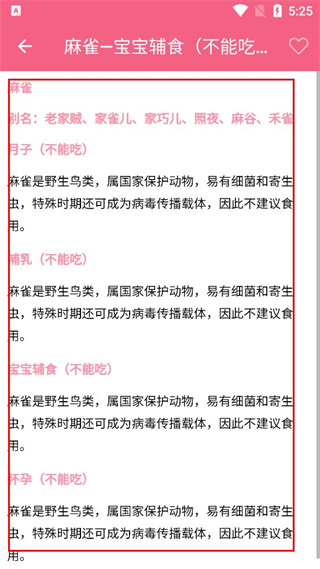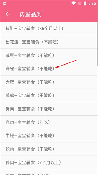 3、在肉蛋品类列表中,找到麻雀宝宝辅食条目,点击进入该食物的详细说明页面。